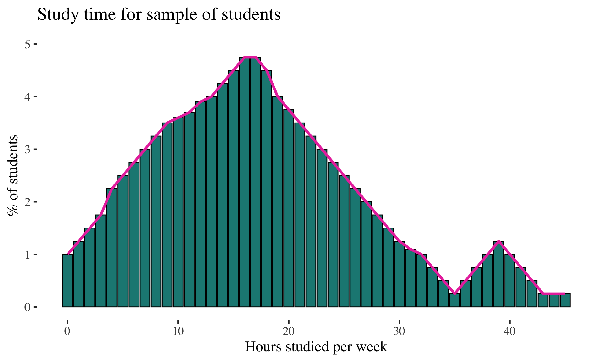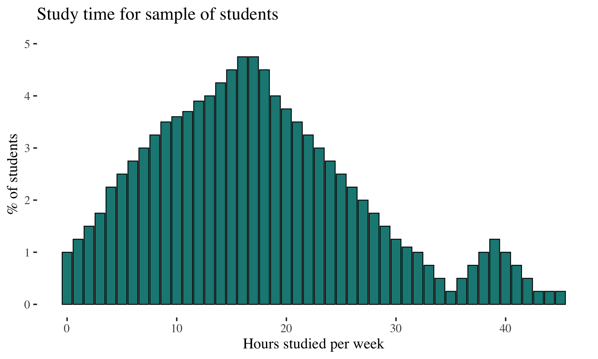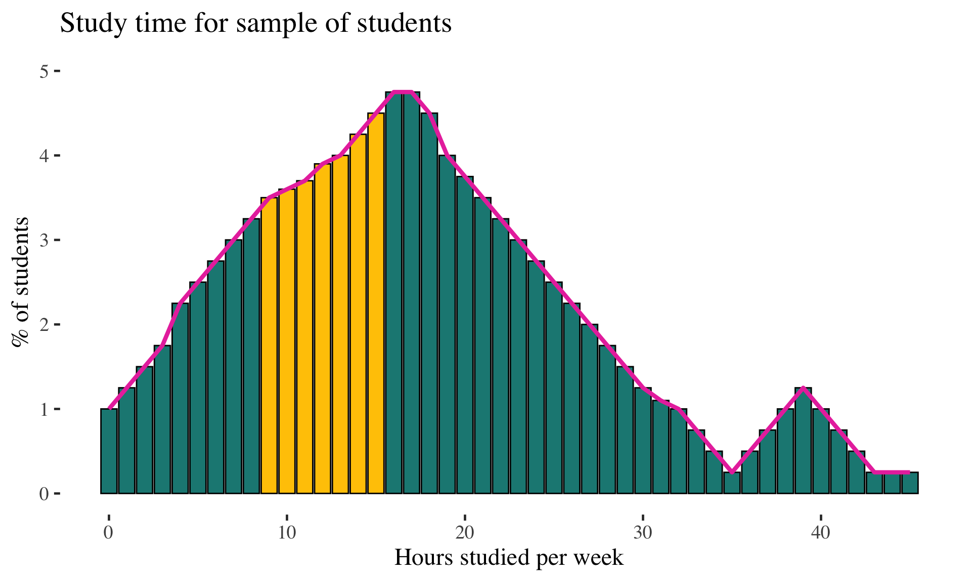 EXAMPLE: If we know that 28.39% of students study between 9 and 15 hours, the probability of selecting a student from this range is .2839
