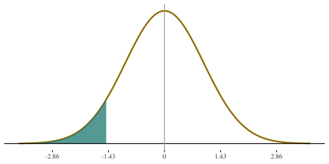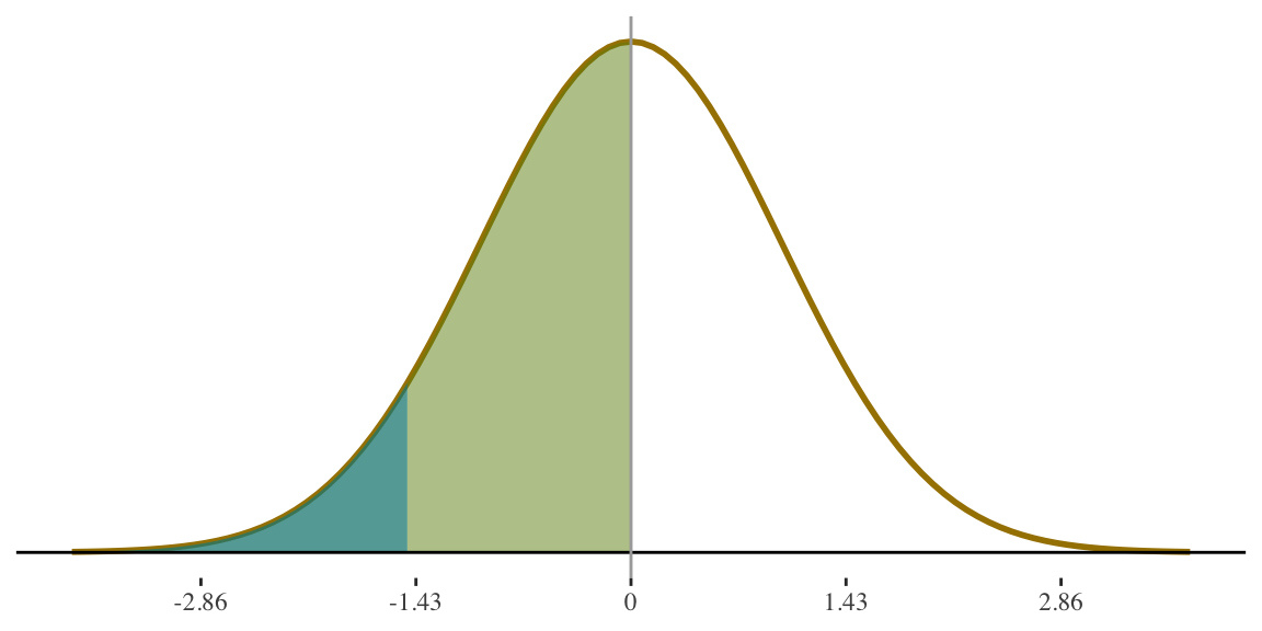 This area is \(0.50 + 0.37345 = 0.87345\) i.e. left half of the distribution plus the area between the mean and z-score of \(1.14\)