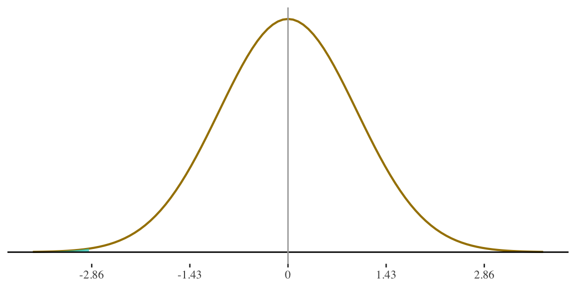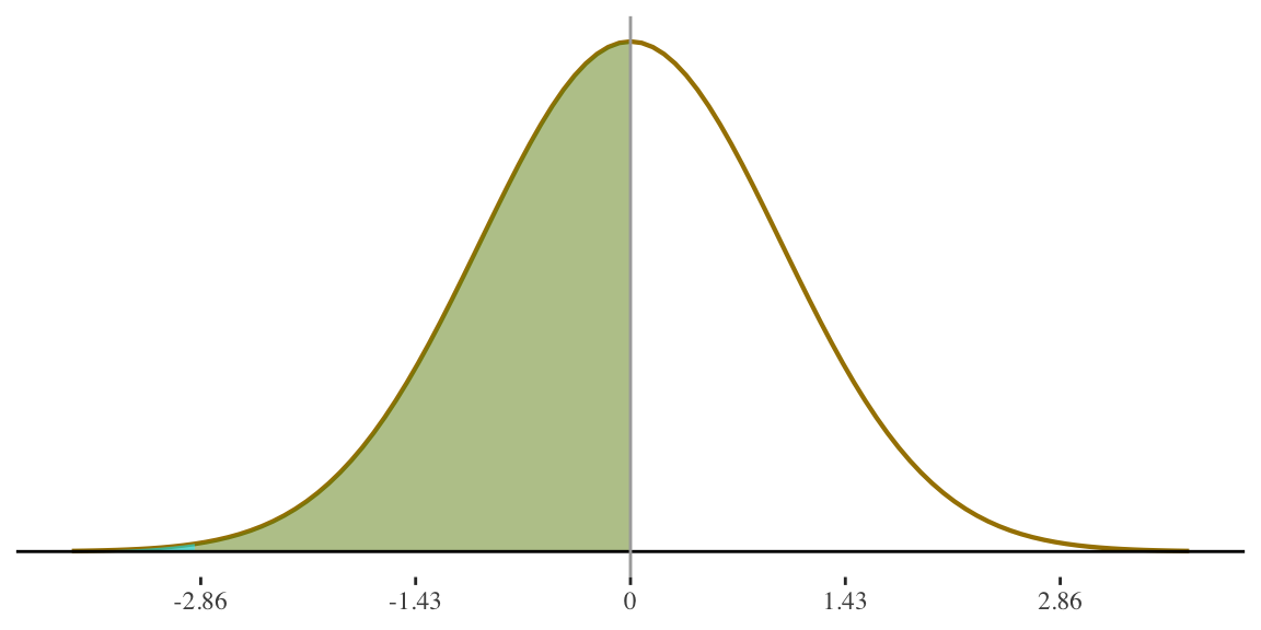 Proportion of cases under this shaded part of the curve is \(.50 - 0.49786 = 0.0021374\)