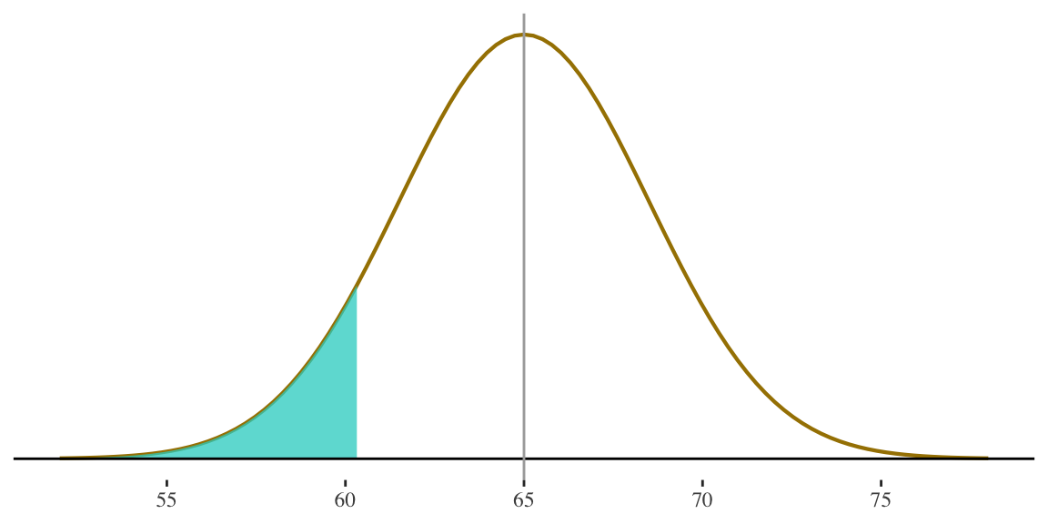5 feet is 60 inches. I know that is somewhere below the mean, and I’m interested in the area below that point.