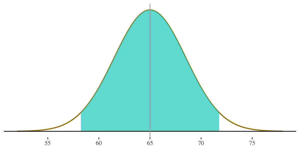 \[ X = \mu + z(\sigma) \] \[ X = 65 + (-1.96)(3.5) = 58.14 \] \[ X = 65 + (1.96)(3.5) = 71.86 \]
