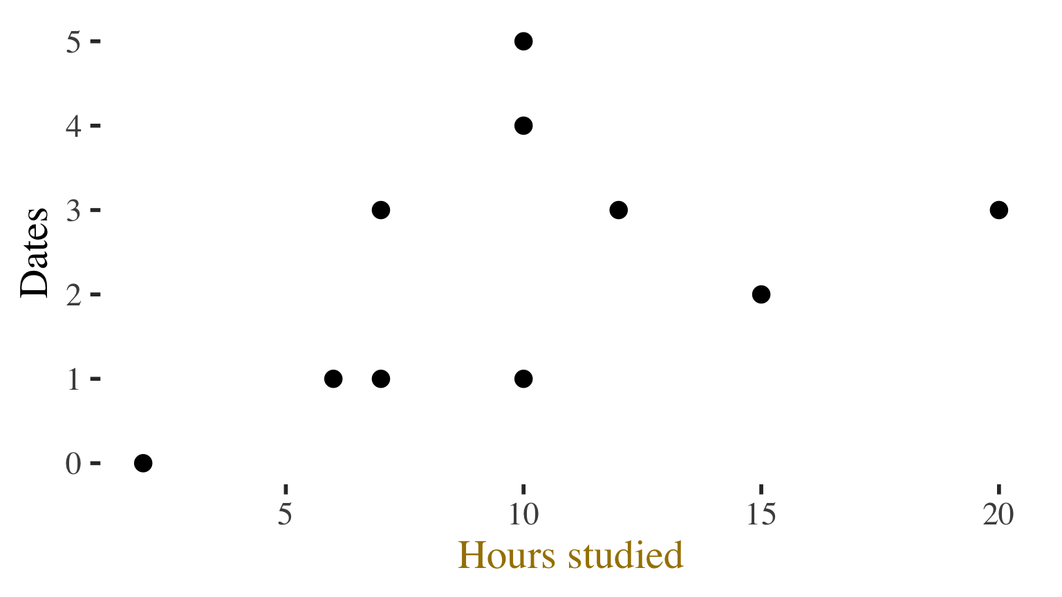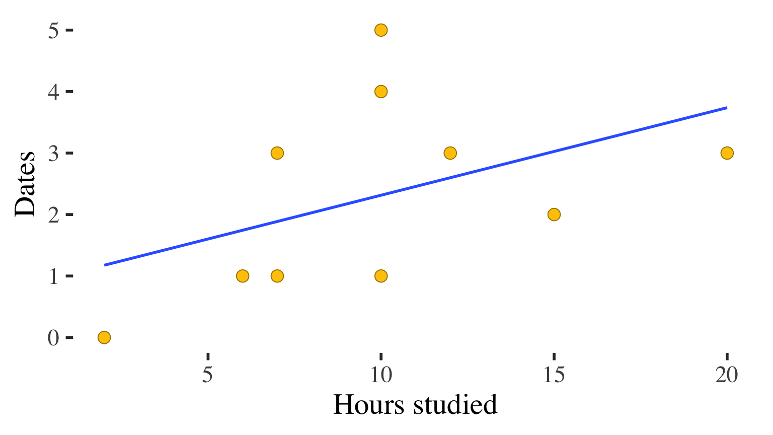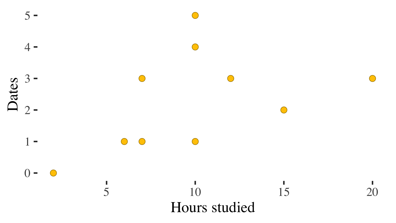 | Person | Hours studied (\(x_i\)) | Dates (\(y_i\)) | \(x_i -\bar{x}\) | \(\frac{x_i-\bar{x}}{s_x}\) | \(y_i -\bar{y}\) | \(\frac{y_i-\bar{y}}{s_y}\) | \((\frac{x_i-\bar{x}}{s_x})(\frac{y_i-\bar{y}}{s_y})\) |