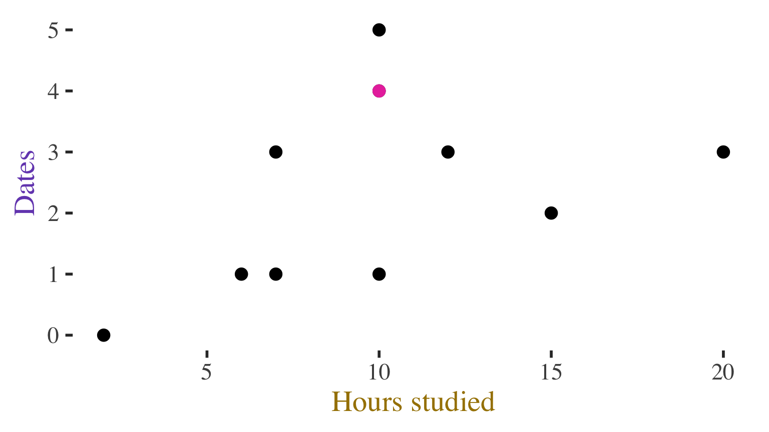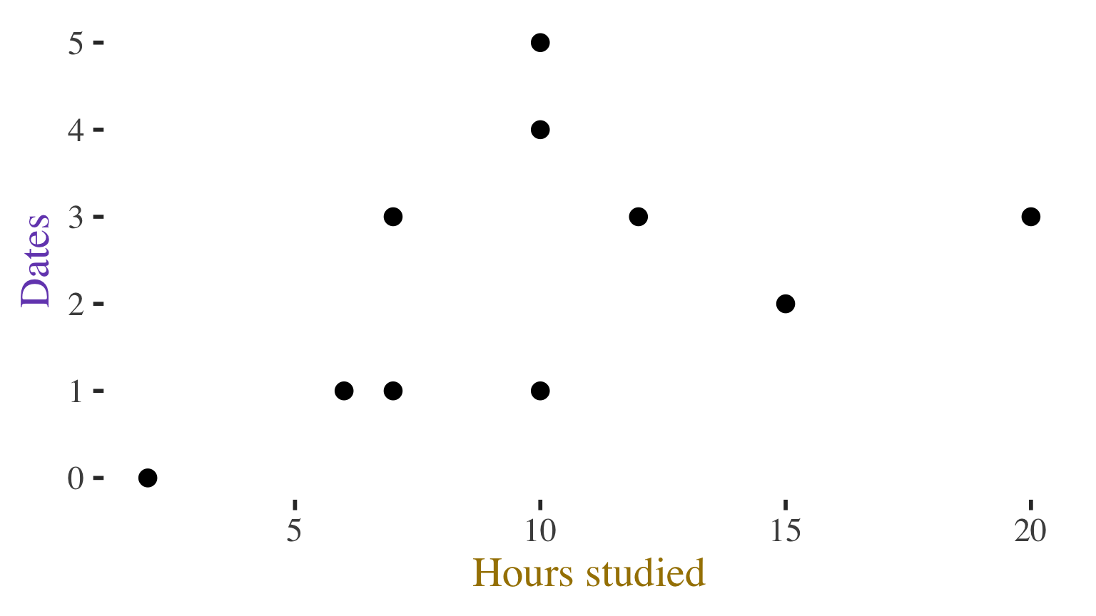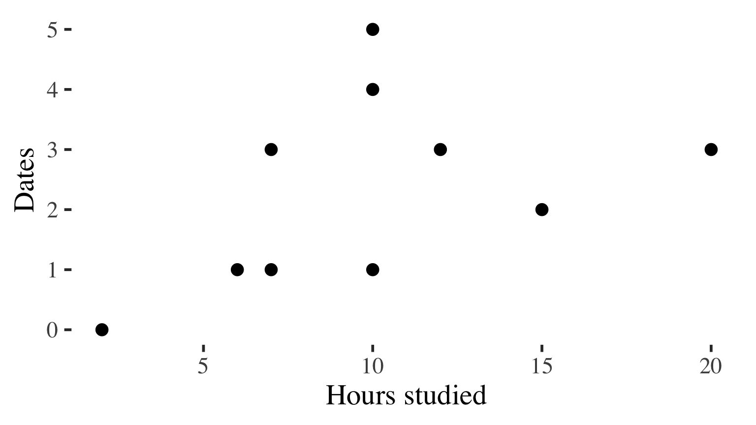 | Person | Hours studied (\(x_i\)) | Dates (\(y_i\)) | \(x_i -\bar{x}\) | \(\frac{x_i-\bar{x}}{s_x}\) | \(y_i -\bar{y}\) | \(\frac{y_i-\bar{y}}{s_y}\) | \((\frac{x_i-\bar{x}}{s_x})(\frac{y_i-\bar{y}}{s_y})\) |